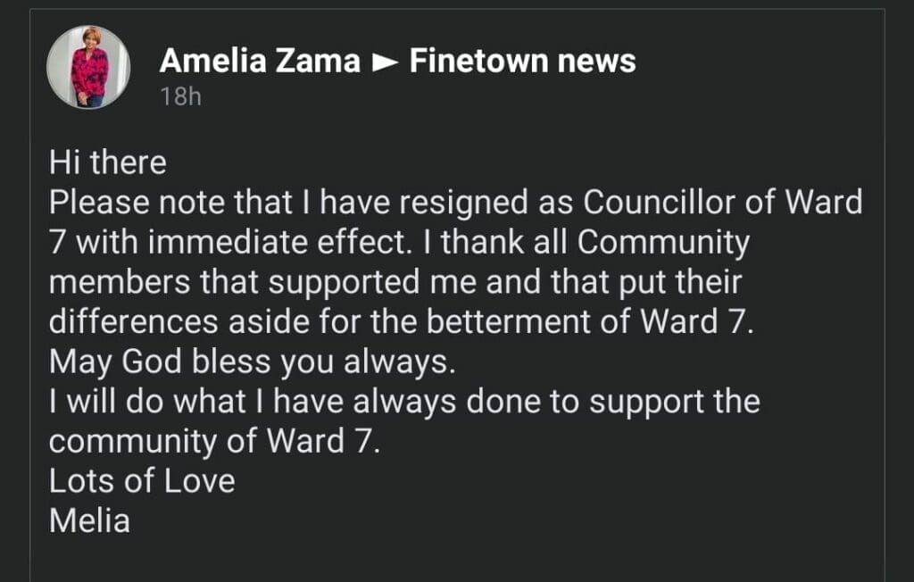 On Friday, 17 March , Ward 7 residents were left shocked following an unexpected social media announcement of resignation by ANC Cllr Amelia Zama.