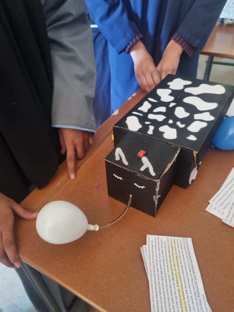Multi-functional Robot: Designed by Maseeha Omarjee and Faatima Badshah, this robot can sweep and write, highlighting the students’ ability to integrate multiple functions into a single build.